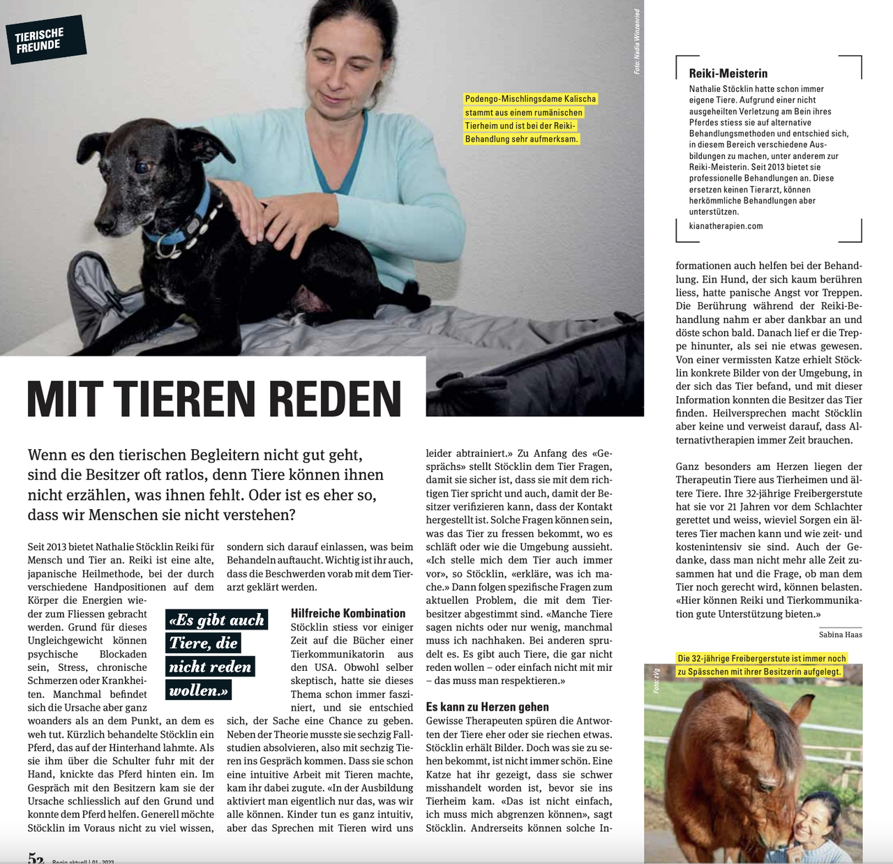 Ich habe die tolle Möglichkeit bekommen, mich und meine Arbeit als Tierkommunikatorin und Reiki-Meisterin im Regio Aktuell vorstellen zu dürfen🎉Das Magazin hat eine Auflage von mehr als 100’000 Exemplaren☺️Im Bericht bekommt ihr einen kleinen Einblick was ich anbiete und wie ich arbeite. Ich freue mich sehr, dass mir dies ermöglicht wurde und bin gespannt auf die Rückmeldungen☺️